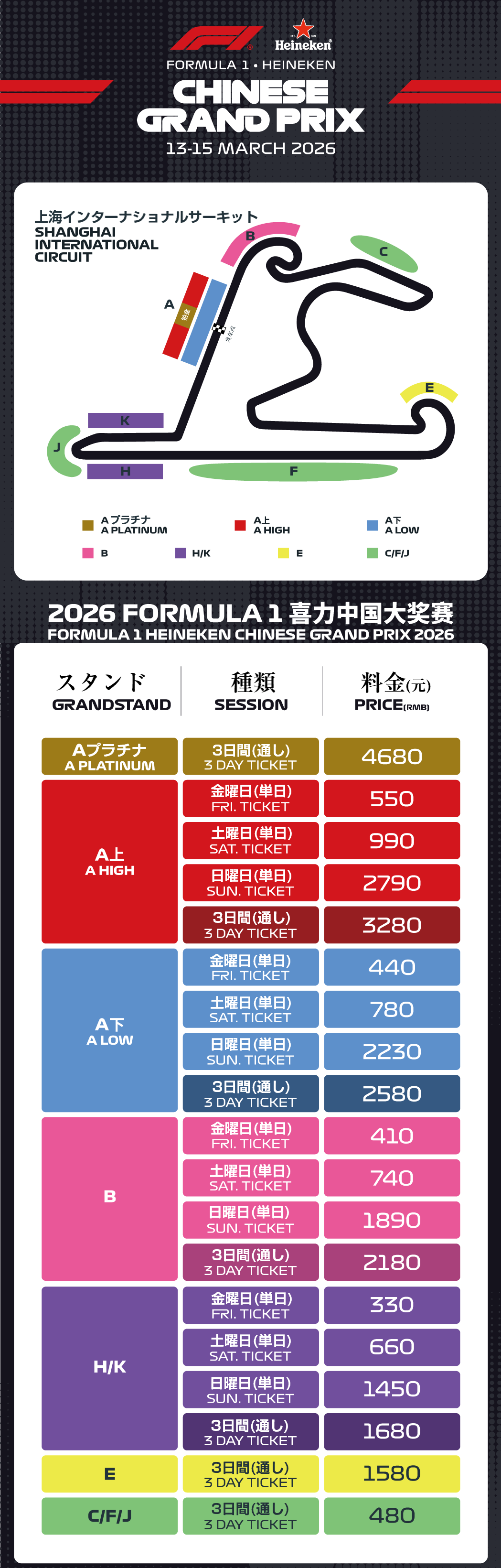 上海インターナショナルサーキットスタンド図 上海インターナショナルサーキットは総工費20億元(約250億円)とも言われる上海国際賽車場は、上海の「上」の字をモチーフにして作られたコースで、そのデザインはマレーシア「セパン・インターナショナル・サーキット」をデザインしたヘルマン・ティルケ氏によるもの。観客の収容人数は20万人で、コース総延長は約5,5キロで、まさにアジアで最大級のサーキットです。 ※公示価格より20%発券手数料が別途かかります。 <<支払方法>> 人民元:銀行振込/Alipay(支付宝)/WeChat(微信) |